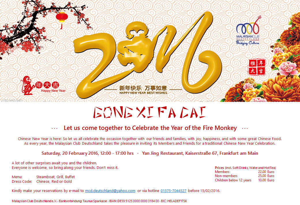Come and join us for the GONG XI FA CAI Year of Fire Monkey celebration.